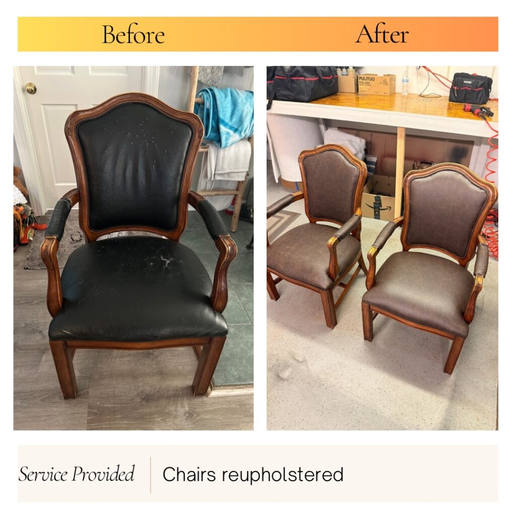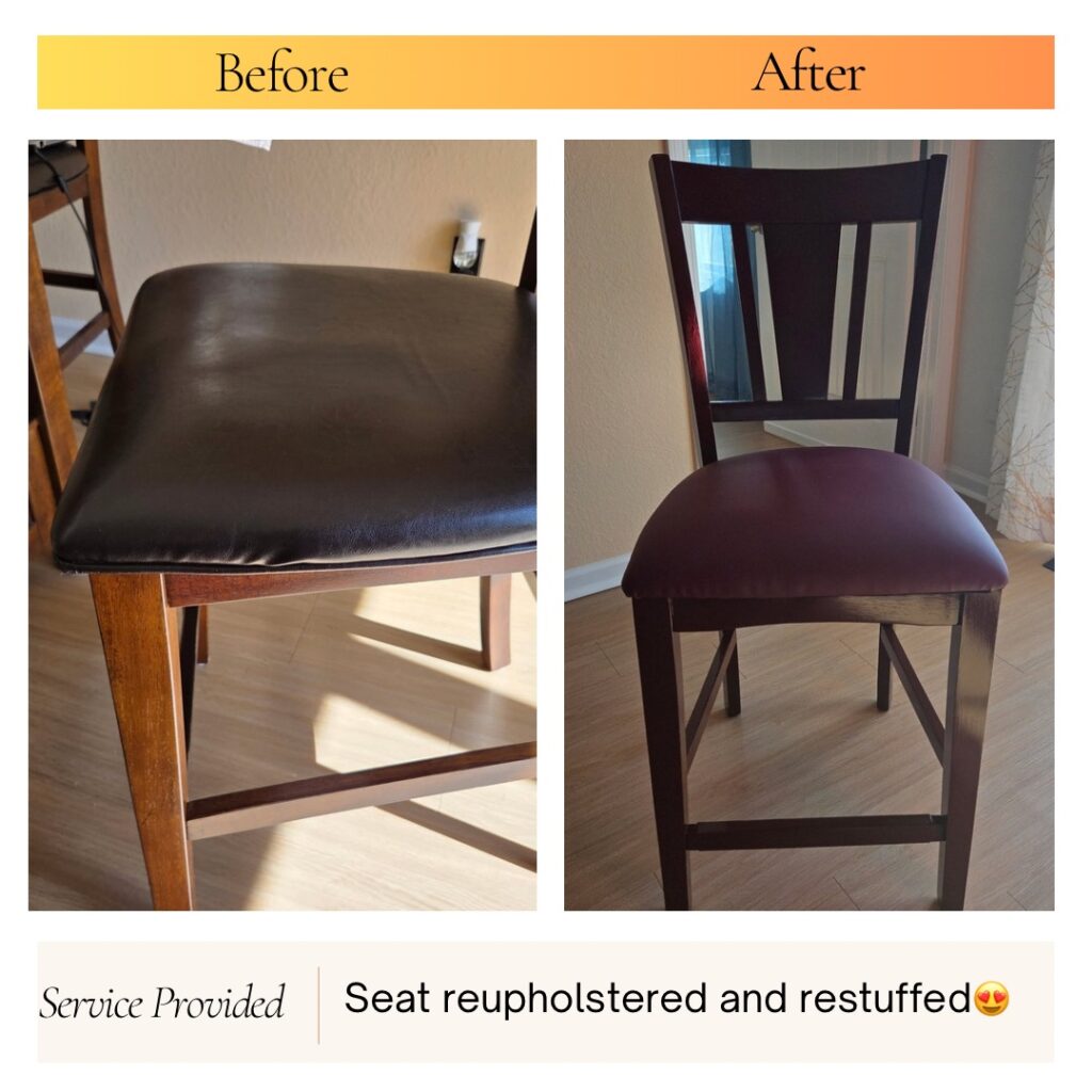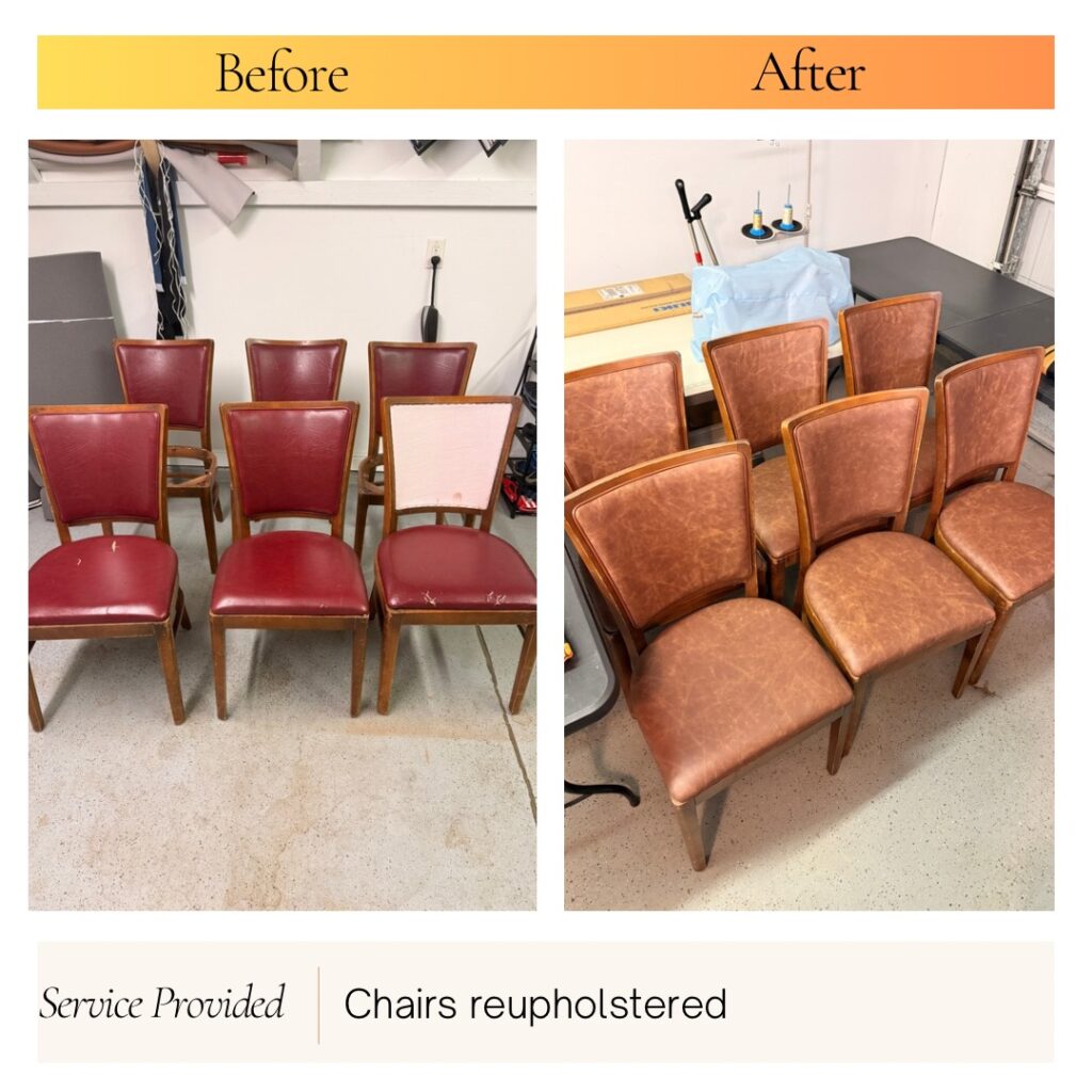 We reupholster dining chairs and bar stools, replace worn seat covers, and restore upholstered chair panels with leather or vinyl.